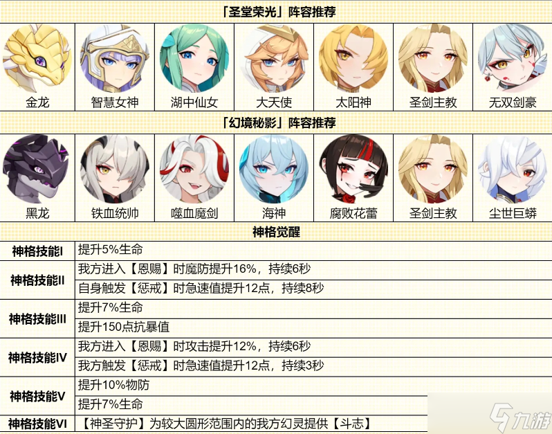 在血量百分比最低的我方幻灵身旁释放一个神圣之盾,每过3秒使其较大圆形范围内的我方单位回复自身最大生命值5.5%的血量,触发3次后消失。神圣之盾释放时为目标幻灵提供【斗志】。