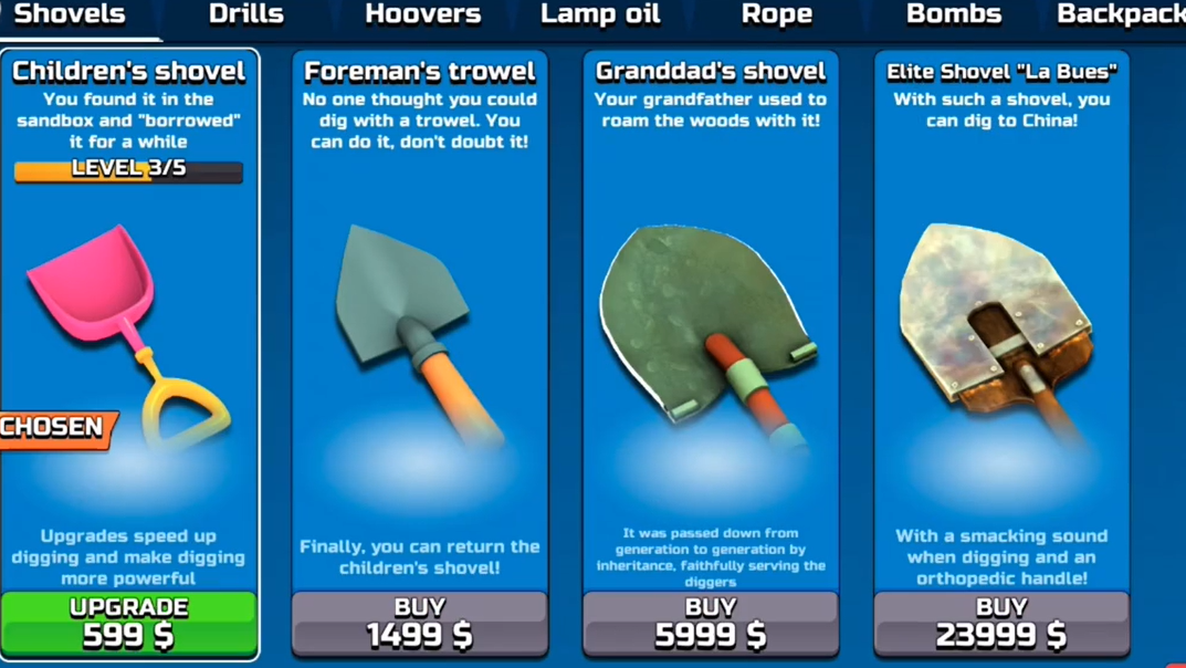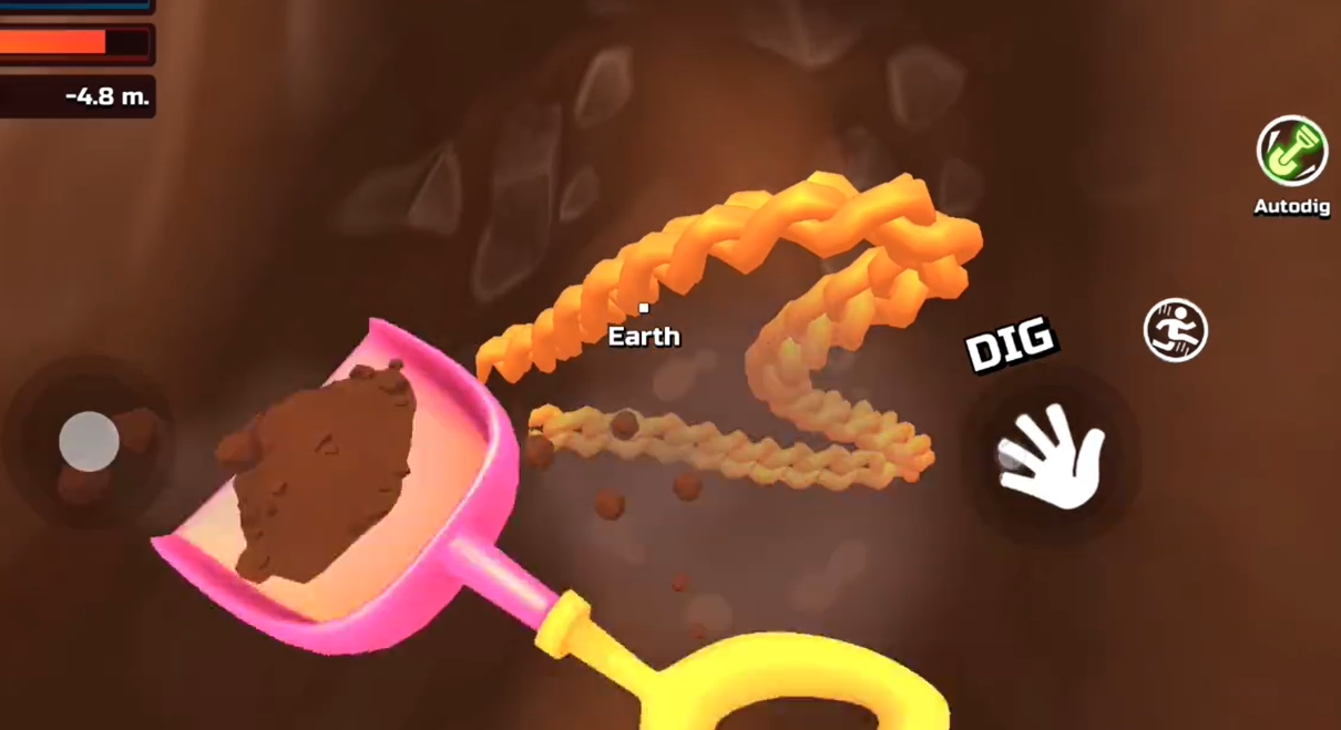 进入游戏,每一位玩家都将会有机会获得属于自己的豪宅,在院子的草坪区域就可以开始挖掘任务。当我们在挖掘宝藏的时候,也要小心邻居的窥探和侦查员的搜捕。千万不要被他们发现了,否则的话任务就会失败,需要重新开启。刚开始挖掘时地表面是一些石头,我们可以选择铁锹或者是其他简单的工具,难度相对来说比较低。越往地底下,深处挖掘石,土地的硬度就会越高,我们可以选择电钻或者是其他更强有力的工具,继续挖掘当然使用这些工具都是需要金币到商店中进行购买的,所以玩家在前期一定要积累足够的资金。