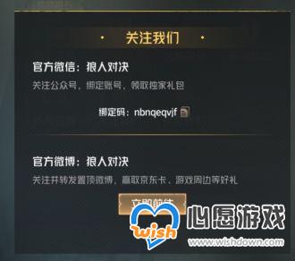 第二步:打开微信,关注“狼人对决”服务号(非“狼人对决手游”)点击菜单栏【福利中心】粘贴绑定码即可。