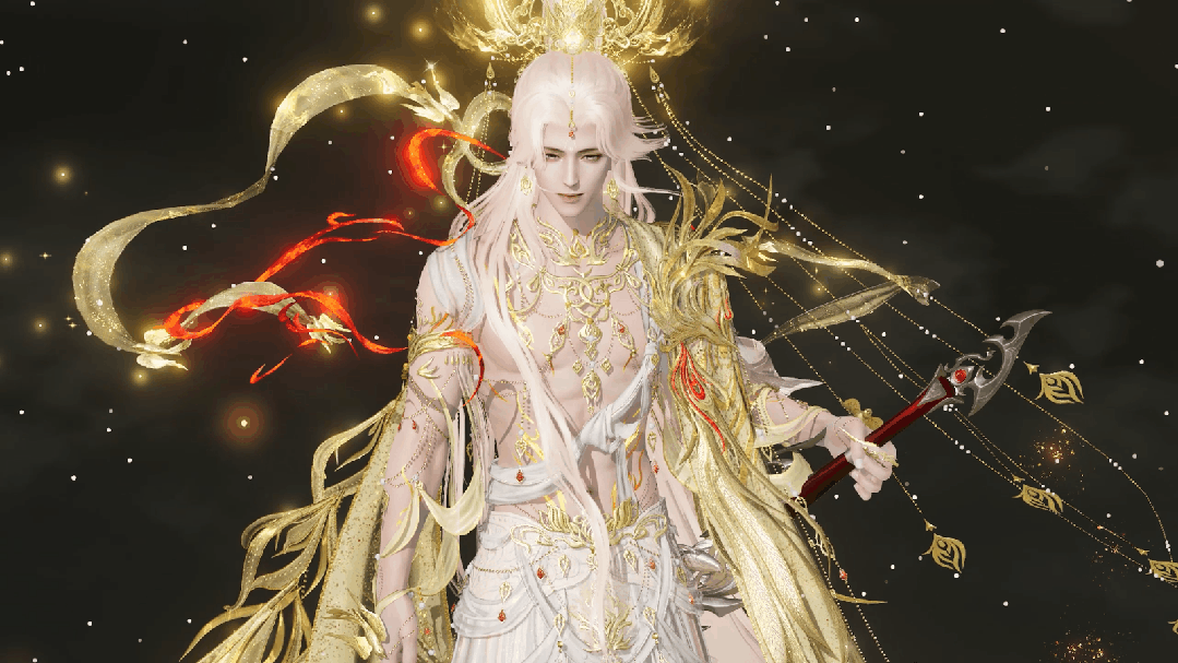 鎏金羽饰如流金锻就,从颈间蔓延至胸腹,如星芒拂过肌肤,似将天河碎星融入了肌理。