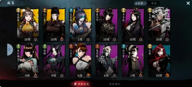 先来说说侠客系统,由于之前测试阶段暴露出的诸多问题,大量侠客都经历了回炉重造的过程,如今游戏中总共仅有13个侠客可供选用,其中金色品质的更是寥寥无几,只有独孤一败和朱荣这两位,这也直接导致当前的流派套路相对单一,搭配攻略的选择空间较小,在这种情况下,比较推荐的编队策略是选择两金四紫的组合来提升整体属性。