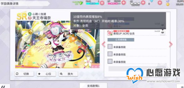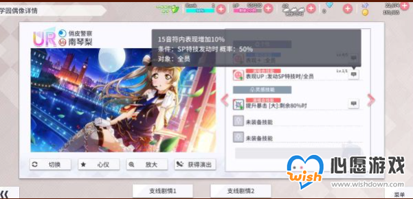 另一个个性技能是在sp特技发动时,有高达50%概率触发,让我们接下来的15音符的表现提升10%,这个技能如果放在AC成功时使用,金色音符的得分将会达到一个很高的数值。