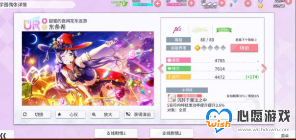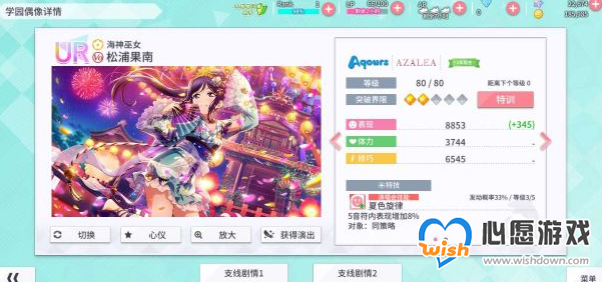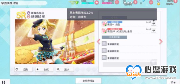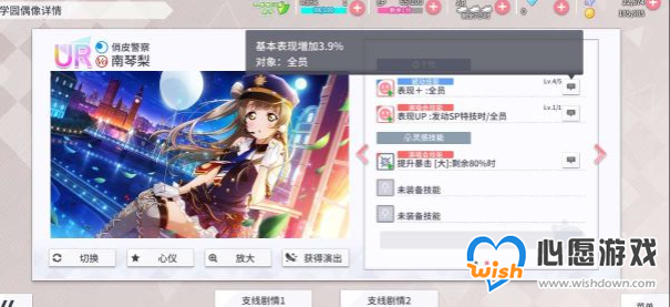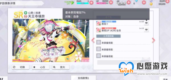 个性技能方面也是增加基本表现,不过这个只对同类型的偶像生效,所以一般队伍最好全部配置Vo类型的角色,使得加成最大化。