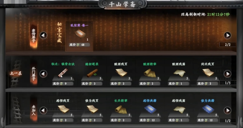 千山学斋:亲传和关门处均有魔学书籍,内门的抱阳剑谱和魔学书籍相结合,外门则有黄连、细辛、半夏等药材。未加入的黑铁、松石、佛学书籍等。