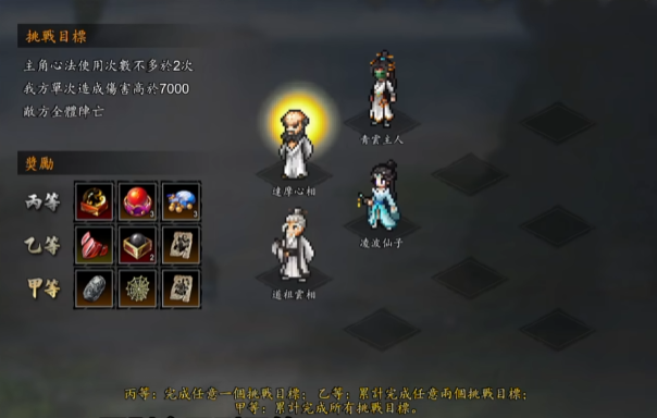 界面右侧实时展示当前层级的敌方阵容构成,包括出场角色的外观特征、武器类型与可能的武学倾向,例如手持长剑的角色多擅长近战快速攻击,身着法袍的角色可能侧重内功远程输出,这些视觉线索帮助玩家预判敌方战斗风格,提前规划应对策略,界面左侧则明确列出该层级的挑战条件,这些条件往往对战斗操作提出限制,由于挑战条件的复杂性与战场局势的动态变化,手动操作模式成为最优选择,玩家可通过实时调整技能释放时机、优化角色站位等操作,精准满足挑战要求。