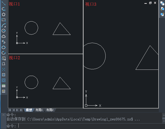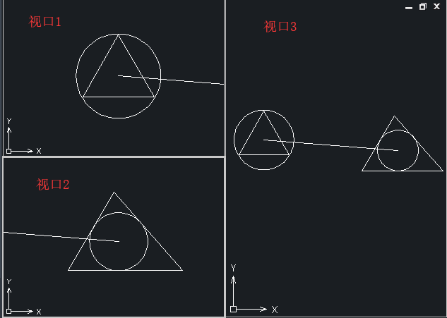 5、鼠标左键单击视口1,绘制圆A的内切三角形,此时可以看到视口3中圆A也绘制了一个内切三角形。同理,在视口2中绘制一个三角形B的内切圆,在视口3中的三角形B里面也绘制了一个内切圆。由此我们可以发现,当操作的图形比较复杂时,可以利用视口功能,放大局部图纸,进行操作修改,而在其他视口中图形也随之更新,如下图所示。