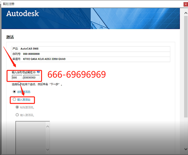 13、输入序列号“666-69696969”,选择输入激活码(如图所示)。