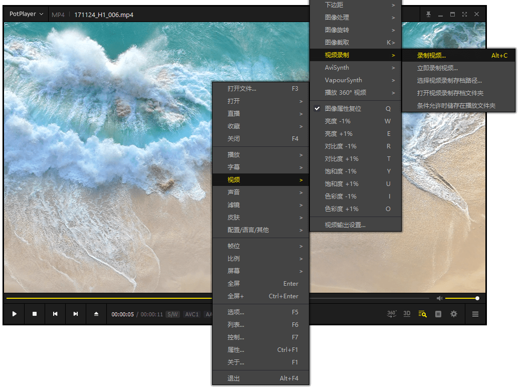 在使用PotPlayer播放视频时,在软件界面鼠标右键选择“视频”-“视频录制”-“录制视频”,也可以快捷键“Alt+C”,便能进行视频录制。