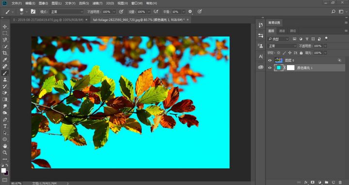 3、回到图层面板,点击图层下方的调整图层,选中里面的纯色,选择一个自己喜欢的颜色(00fffa),移动到图层0下方,我们再看下效果图▼