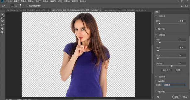 5、我们可以在柔和下边缘,左手按住Ctrl键,鼠标左键点【图层2】缩览图,载入选区,打开右上方【选择并遮住】工具,参数设置及效果如下图▼