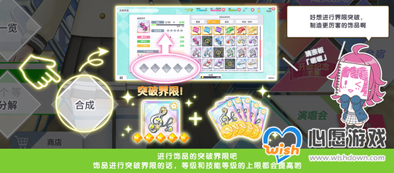 合成时消耗稀有度和种类均相同的饰品可以突破饰品的等级和技能等级上限,有多余的饰品时可以合成高等级饰品以增加队伍属性。