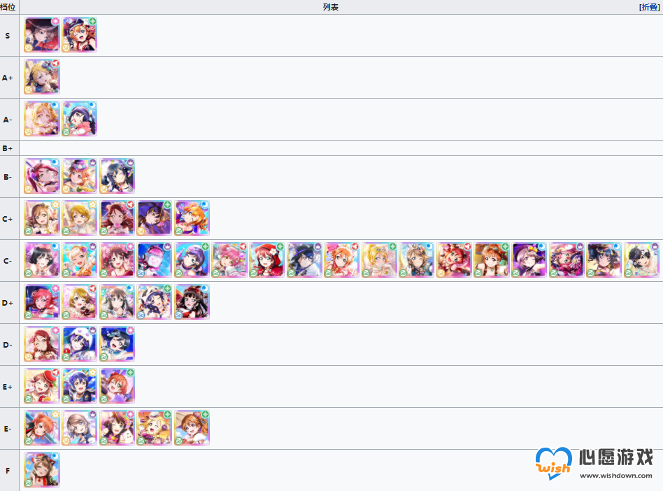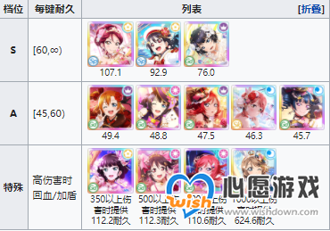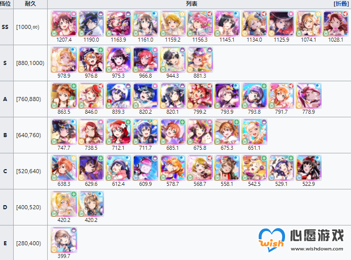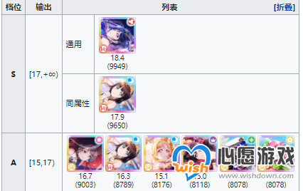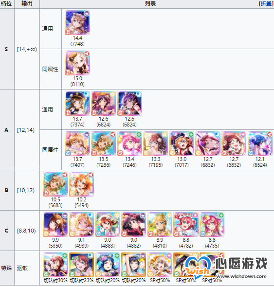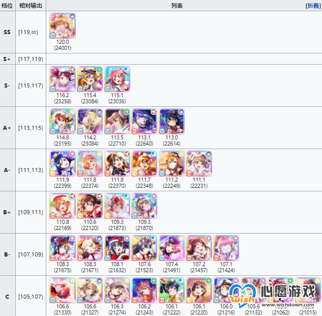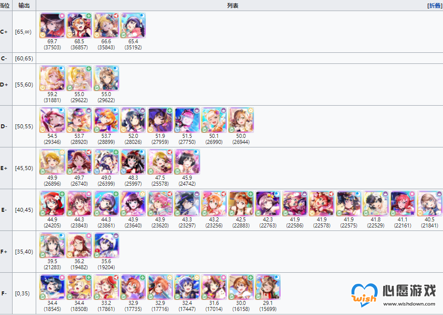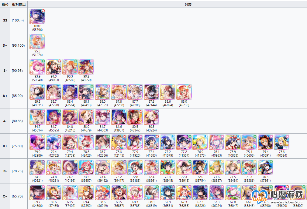 卡片的绝对输出值为该卡片在顶配队伍中且与歌曲同色时每个键所贡献的分数;卡片的相对输出值以fes1果南为100为标准。本榜列出了所有相对输出不小于65的卡片