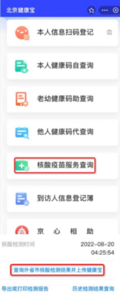 打开北京健康宝-选择图1的核酸疫苗服务查询,然后点击图2的查询外省市核酸检测结果并上传健康宝即可。