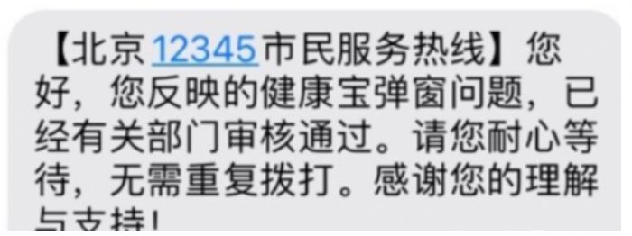 提交完成后,如果成功,会收到北京12345健康宝弹窗问题审核通过的短信,收到短信再查看,就不会弹窗了。