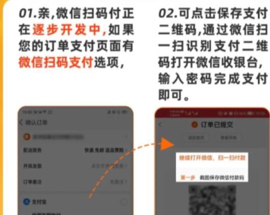 注意:目前,微信扫码支付是淘宝针对无支付宝绑卡,且支付宝无余额的部分用户,推出的能够通过微信支付淘宝订单的服务;用户在提交订单页可选择使用微信扫码付或去微信找朋友帮我付的付款方式进行付款!