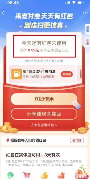 如果你支付宝里还有昨天领取的红包没有使用的话,扫码之后显示的就是下面这样的,大家需要花销了才能使用,可以看一下截图显示: