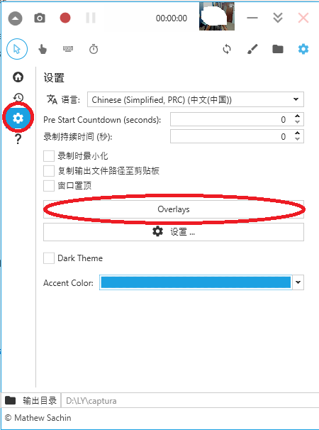 4、接着如果想调整摄像头在屏幕中的位置大小 ,点击设置按钮,然后点击overlays;