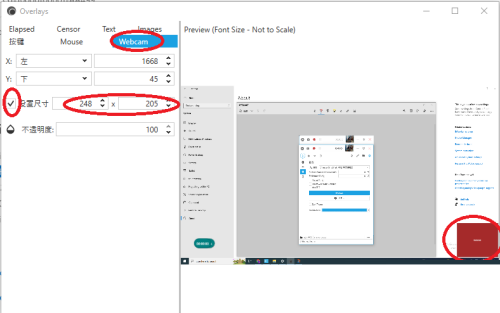 5、在弹出的对话框中选择Webcam,在“设置尺寸”前面打勾,然后设置摄像头录制屏幕的大小,也可以用鼠标将红色的方块(摄像头录像区域)进行拉伸或缩小调整大小。还可以拖动红色的方块,放到需要的位置。
