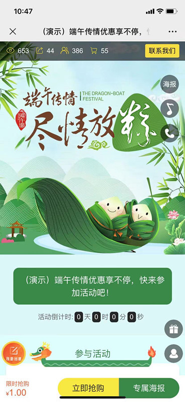 在传统节日提高销售,并不是只有线下促销卖场可以做,在线上同样能够为促销做宣传推广,从而将线上聚集的大量流量进行有效的转化,红包拓客为营销者准备的活动促销活动,能帮助营销者将促销卖场搬至线上,简单轻松的替换H5模板中的产品,即可在端午节日开展线上宣传与推广。