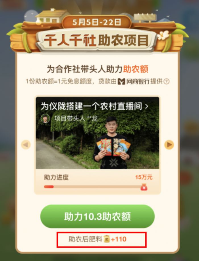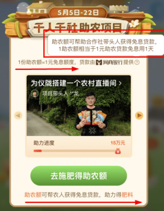 您可以使用“助农额”为优秀农人助力,帮助他们获得更高的免息贷款额度,具体贷款实施工作由网商银行提供。