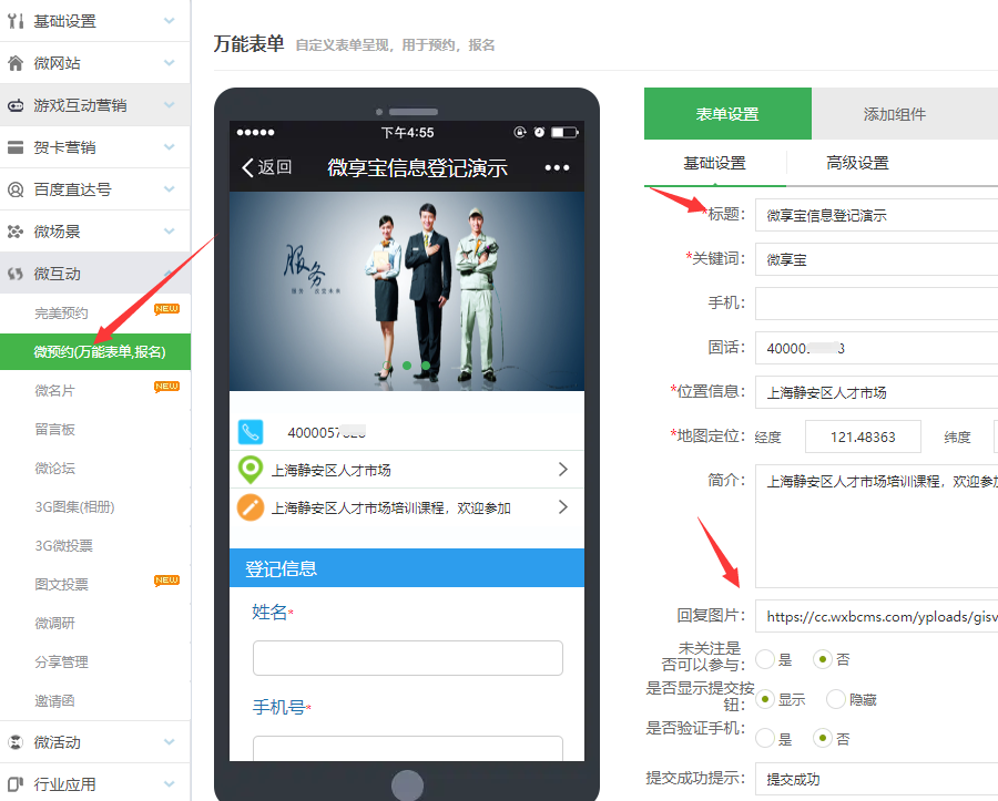 第二步:进入功能管理页面找到微互动,打开微预约万能表功能,点添加表单之后进入编辑页面,然后根据我们的需求来填写信息收集的内容,先把基础设置和高级设置,打开填写,要注意的是在高级设置里边可以限制提交微信报名活动的人数和每人的提交次数