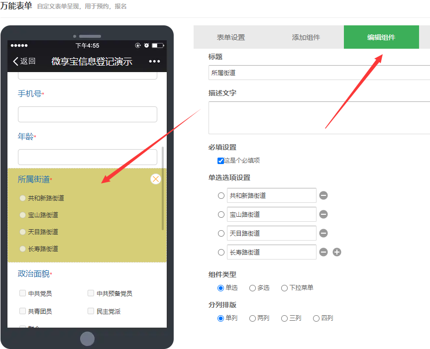 第三步、弄好以后点击输入项管理添加组件选项,选择需要添加的组件,比如姓名、联系人、联系电话等需要收集的信息,输入类型有多种选择,可以用户自行填写也可以让用户选择,还有图片上传控件,下面是演示数据,可以根据自身需要添加字段