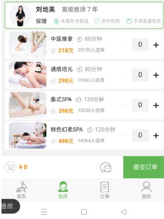 点击立即下单,首页会根据销量多少展示项目类型,在这个页面可以选择想要的服务,然后点击选择技师,就可以预约技师下单了,也可以格局标签,好评进行选择,其次是理疗师选择,你可以通过查看技师详情页展示,了解技师所做的服务类型进行选择技师。