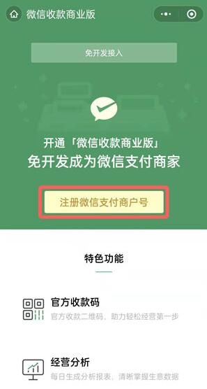 2、点击小程序进入,然后点击【注册微信支付商户号】按钮;