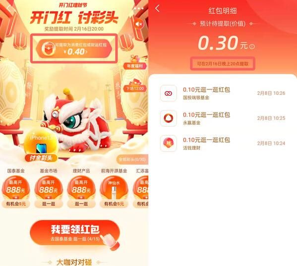 通过讨彩头的活动获得的现金红包可以提现,可以通过活动页面点击查看你可以提现的讨彩头红包,进入后查看自己可以提现的余额,并根据页面提示查看可提现时间,在指定时间后进行提现。