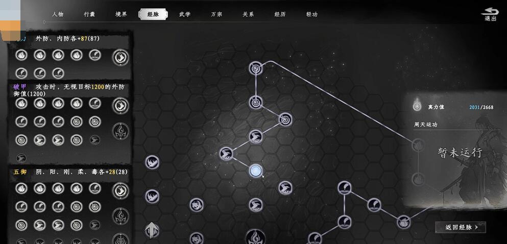 经脉书的使用需结合穴位激活与周天运行,基础激活步骤:穴位解锁:打开经脉界面,消耗修为点激活穴位。前期材料稀缺时可直接点满整条经脉,后期补加心法。洗练词条:点击已激活穴位,选择 洗练,消耗经脉书附加属性。例如七阶卷可洗出 ”阴 + 15“” 内息 + 8%“ 等定向词条。周天运行:在经脉界面右下角点击 ”运行周天“,将穴位连成闭环。推荐初期连接带脉 5 点获取根骨 + 29,满足境界突破需求。