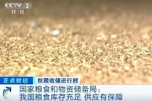 国家粮食和物资储备局相关负责人今天(11月3日)表示,我国秋粮收获接近尾声,全年丰收已成定局,产量将连续7年保持在1.3万亿斤以上,当前库存总量充足,处于历史高位,国内粮食市场供应完全有保障。