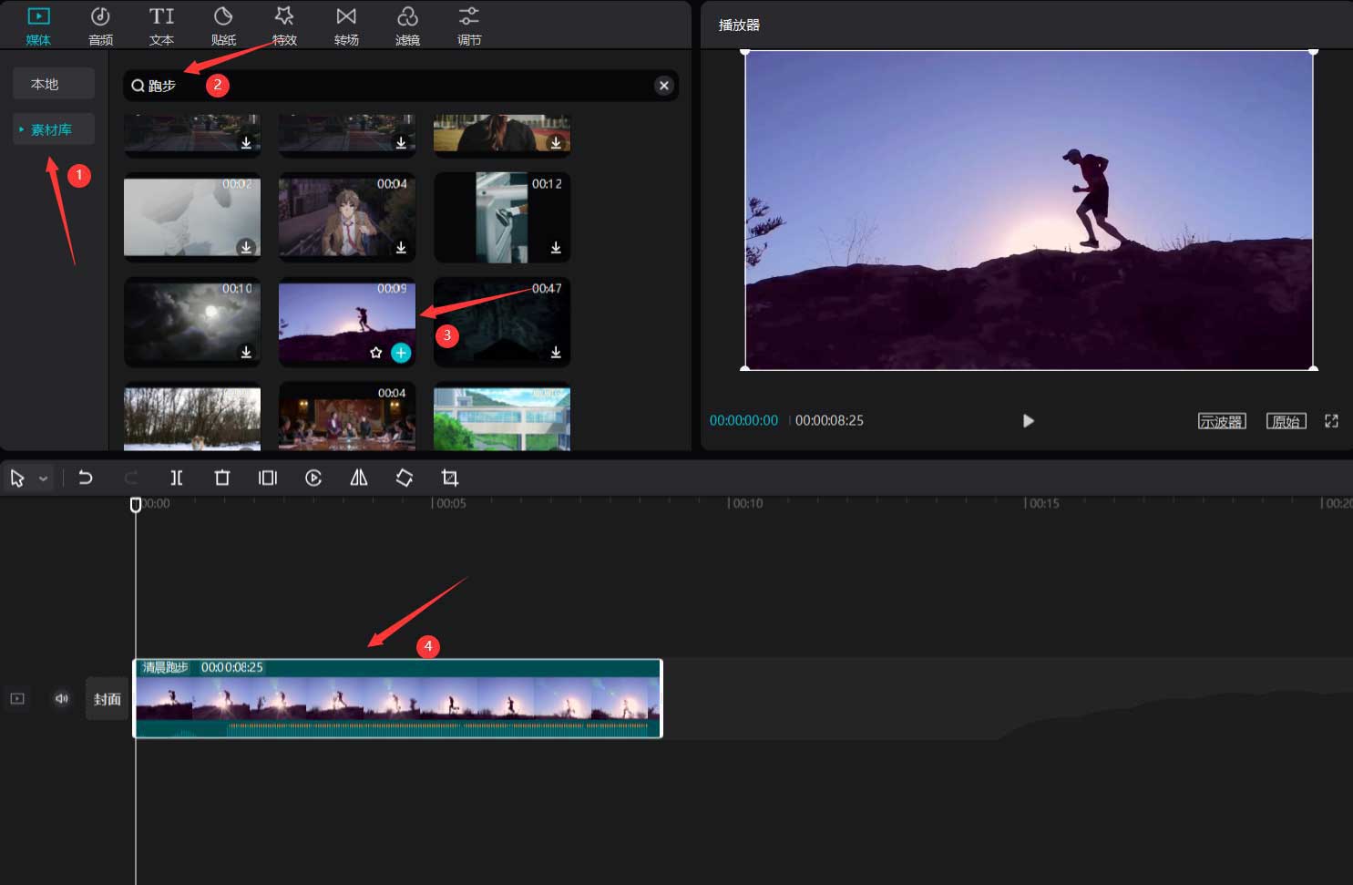 点击素材库按钮,在搜索栏中输入跑步两字,选择一段视频素材(最好选择运动路径为从左到右或从右到左的素材,这种素材效果比较直观),见下图。
