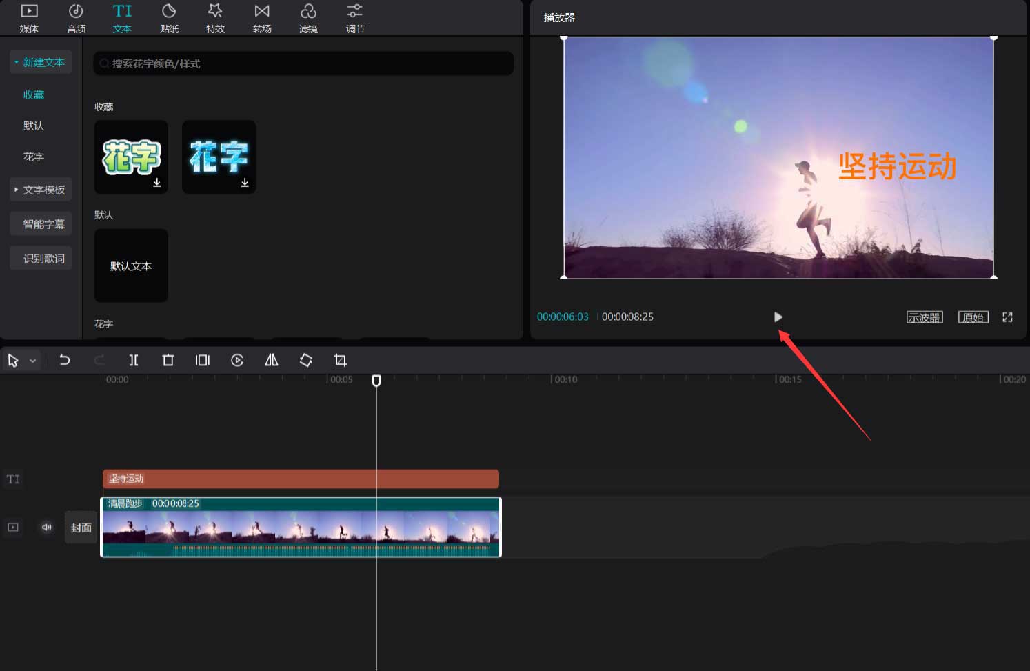 点击文本按钮,选择默认文本,将其添加到文本轨道中,见下图。
