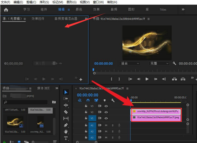 1.在左上角的文件源窗口中导入视频素材,并用鼠标将其拖到时间轴上
