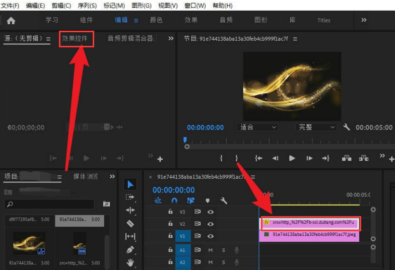 2.选中时间轴上的黑色背景,点击效果控件按钮