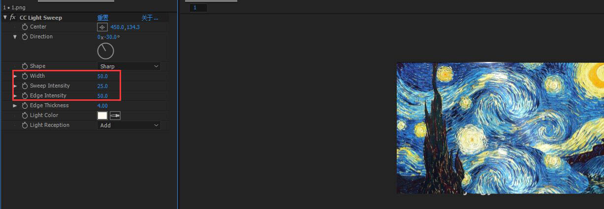 选中素材图层,添加CC Light Sweep 扫光效果,效果-生成-CC Light Sweep;