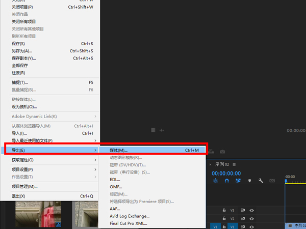 1、首先在pr中点击文件>导出>媒体(ctrl+m),即可进入导出设置页面。