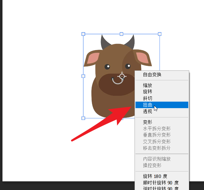 一般情况下在自由变换状态下,在小牛图片上右击,点击“扭曲”。
