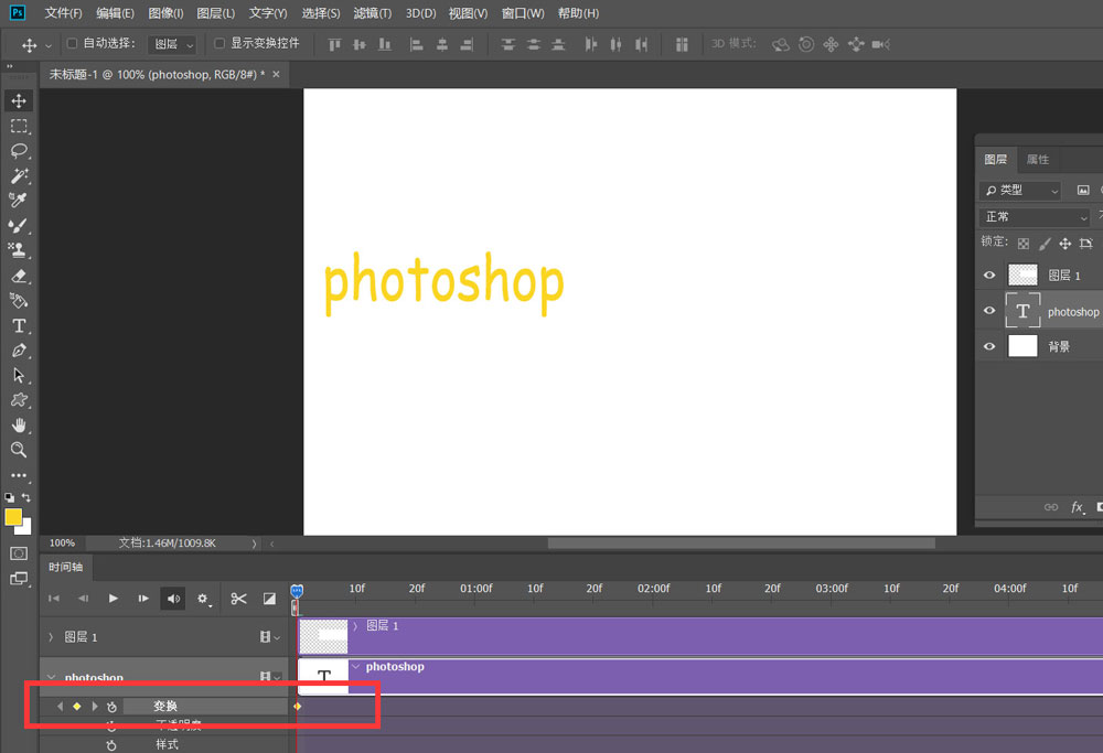 移动时间轴滑杆到时间轴后方,然后在画布上将文字平行向右移动,可以看到,时间轴上变换选项上自动记录第二个变换点。