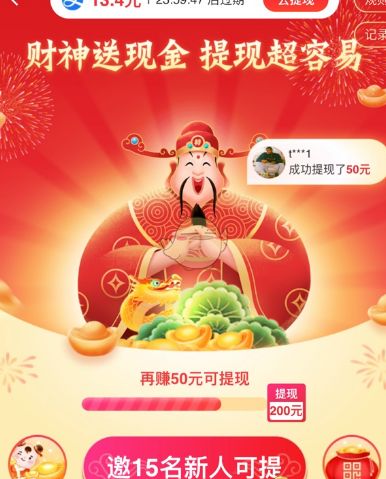 2、每日领钱活动是邀请老用户就能领现金,财神到活动是需要邀请新用户才能成功的。大家可以根据自己的需求选择活动参加。提现方面的话是确实可以到账的,而且是秒到支付宝。