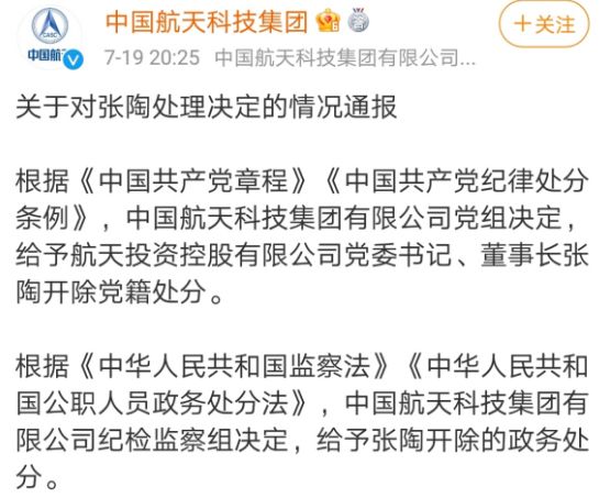 根据《中华人民共和国监察法》《中华人民共和国公职人员政务处分法》,中国航天科技集团有限公司纪检监察组决定,给予张陶开除的政务处分。