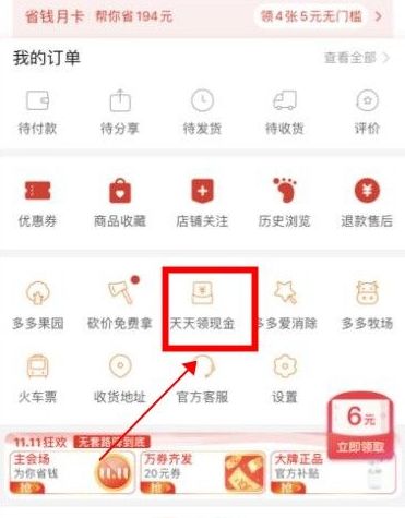 打开拼多多,在个人中心页面,点击天天领现金,进入页面,点击右侧每日领现金进行抽奖,抽中免单活动,选择去免单,在下单全额返页面就可以进行购买商品参与满三单免一单了。