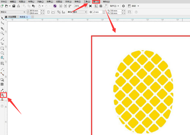 4.点击智能填充工具为图形填充黄色,删除黑线轮廓,点击窗口菜单中的泊坞窗选项,将图形修改为圆角即可