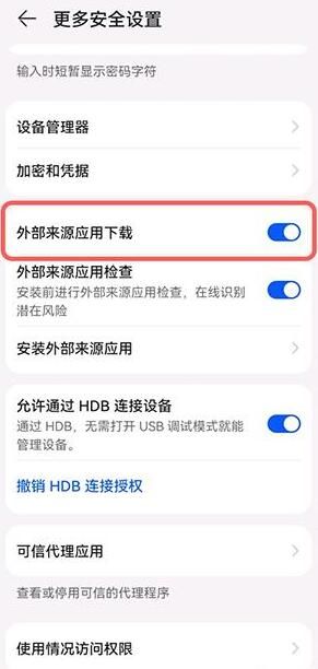 3、点击【外部来源应用下载】右侧的滑块,开启后可允许第三方应用下载;