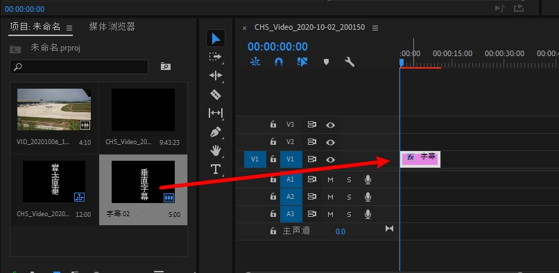 1.把垂直字幕拉入编辑区,播放头就是蓝色线移到字幕开始。