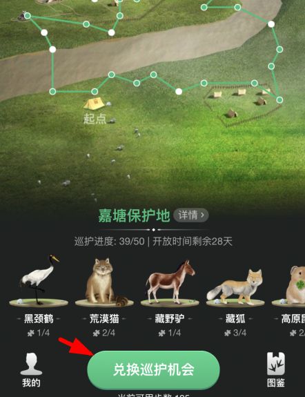 点击后,即可进入到嘉塘保护地页面,点击下方的【开始巡护】,就可以获得动物碎片了,集齐4个高原鼠兔碎片,就可以召唤高原鼠兔了。
