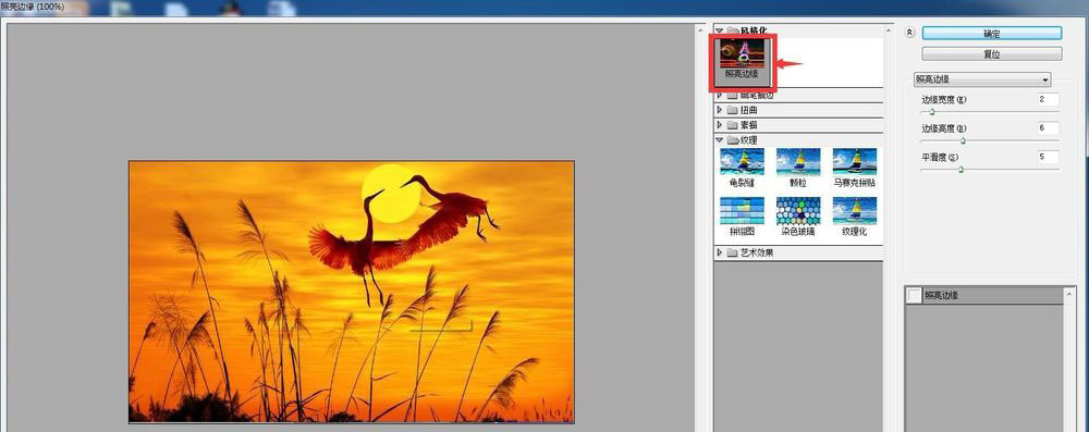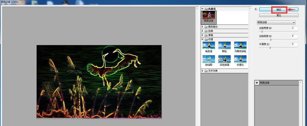 将边缘宽度设为2,边缘亮度设为6,平滑度设为5,然后按确定;