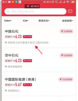 3、登陆之后,就能看到离附近的各大加油站了,可以根据标签进行筛选,如距离、汽油型号、品牌等等。