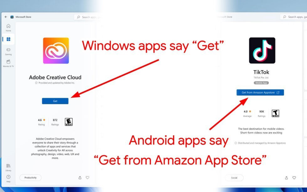 我们还没有亲眼看过在Windows11上安装安卓应用程序的完整过程,因此尚不清楚其中具体的运行模式。微软发布了几张截图,图片显示微软应用商店在推广亚马逊应用商店中的安卓应用程序。看起来亚马逊商店的应用程序评论、屏幕截图和说明会列在微软应用商店中,但微软应用商店似乎并不能真正安装安卓应用程序。关键就在这个“安装”按钮上。如果是Windows应用程序,按钮上显示的是“获取(Get)”,表明点了就会安装应用程序。但是如果是安卓应用程序,按钮上的内容完全不同——“从亚马逊应用商店获取应用程序(Get from Amazon App Store)”,还带有一个小框和一个箭头组成的小图标,表明点了会链接到一个外部的应用程序。
