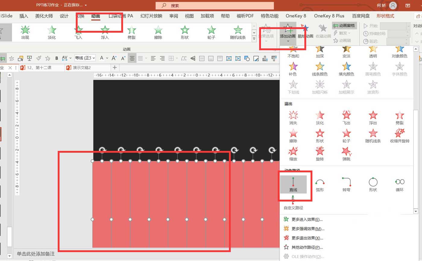 4、全选矩形,移动到PPT下方三分之一的位置,点击【动画】-【添加动画】-【直线】,如图4